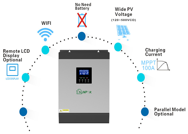 Inverter off-grid frekuensi tinggi satu fase Sunpok 5Kw cocok untuk area tanpa daya, area nomaden, stasiun basis komunikasi, area dengan daya tidak stabil, pulau, pos perbatasan, kantor manajemen pemandangan, kios koran, paket baterai untuk produsen baterai, dll. Dilengkapi dengan tampilan LED, mendukung USB/RS232/RS485/Bluetooth/Dry-contact, desain yang ringkas, dan performa berbiaya tinggi.